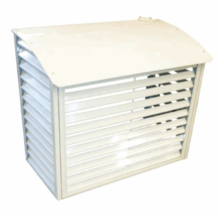 Beskyttelseshus til varmepumpens utedel i elforsinket og pulverlakkert metall.