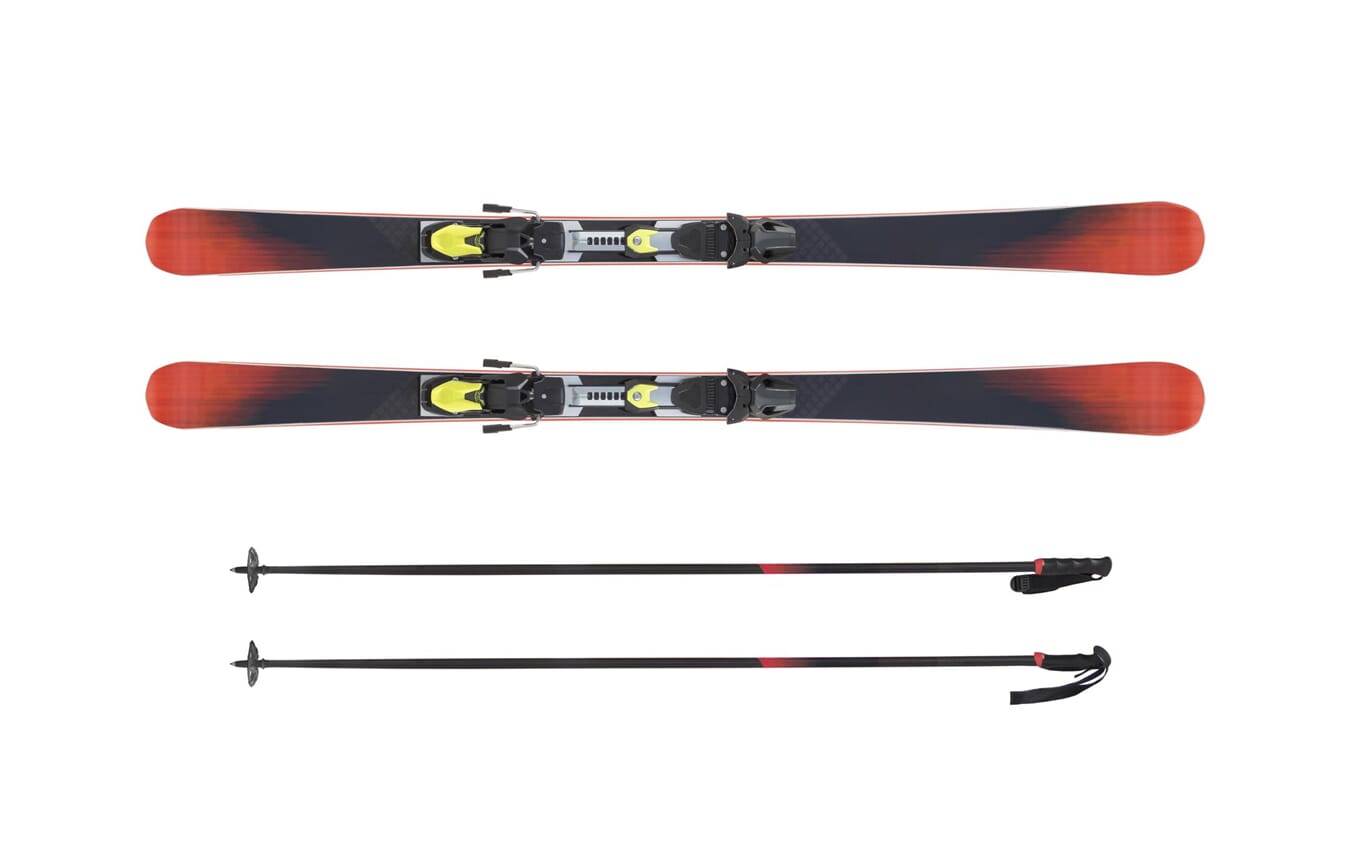 Skipakken inneholder ski, staver, fellesystem, og bindinger